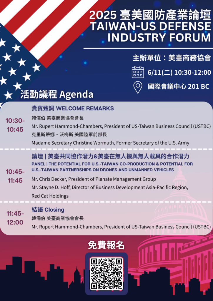 The US-Taiwan Business Council is pleased to host the Taiwan-U.S. Defense Industry Forum in Taipei, Taiwan on June 11, 2025. This event will examine the potential for U.S.-Taiwan Co-production and for U.S.-Taiwan partnerships on drones and unmanned vehicles. Please join us for an excellent round of discussions on these important topics!